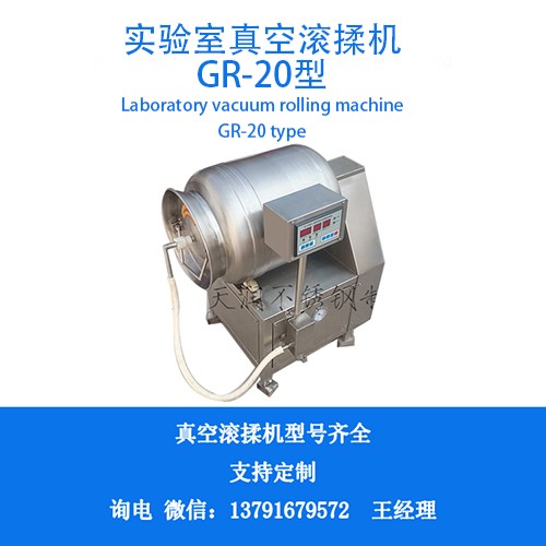 GR-25L小型實驗室真空滾揉機:工作原理:真空滾揉機是在真空狀態下,利用物理沖擊原理,讓肉塊或肉餡在滾簡內上下翻動,從而達到按摩、腌漬作用。腌漬液被肉充分吸收,增強肉的結合力和保水性,提高產品彈性及出品率。